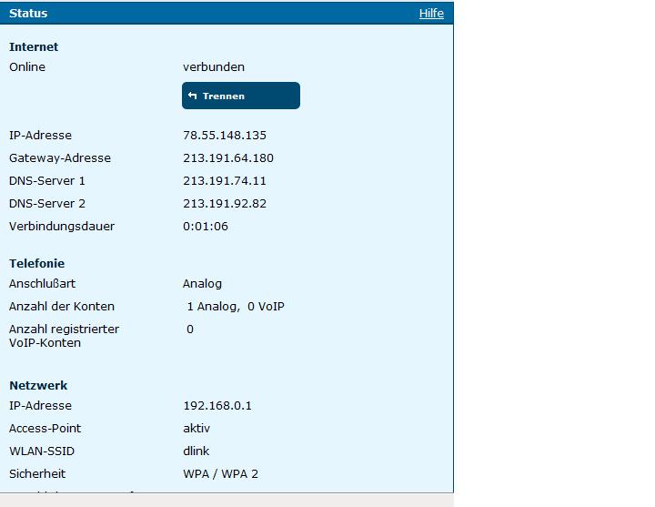 Ich habe einen Screenshot angefertigt, im übrigen, alle Lampen meiner Hostbox(Power,ADSL,Wlan,Lan) leuchten dauerhaft blau.