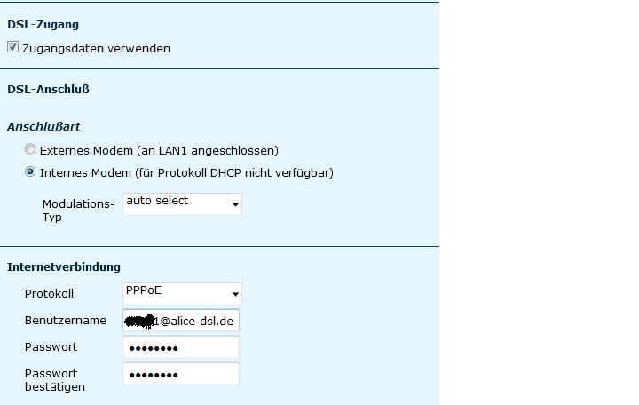 Du könntest ja mal die Kabel tauschen um das auszuprobieren. Ein Passwort ist normalerweise nicht nötig, bei einigen soll es schon mal geholfen haben wenn sie als Passwort auch die VorwahlRufnummer eingetragen haben. Ansonsten ist die Konfiguration eigentlich kein Hexenwerk und wird hier auch nochmal gut beschrieben. Die VPI/VCI Werte sind sogar für Alice identisch ebenso wie der MRU und MTU Wert.