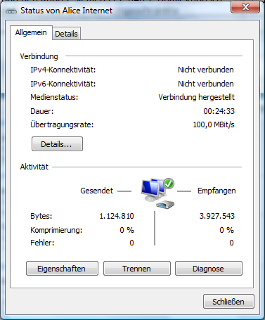 Ich habe einen Alice DSL 16k Anschluss und den Router Siemens CL-040-I. Damit kann ich zwar ins Internet, allerdings zeigt mir Windows (Vista SP2) nur "eingeschränkte Konnektivität" an. Das Netzwerk u. Freigabecenter zeigt mir eine funktionierende Verbindung an, außer die vom Router zum Internet. Klicke ich dort auf Diagnose scheinen allerdings keine Probleme erkannt zu werden. Screenshot: