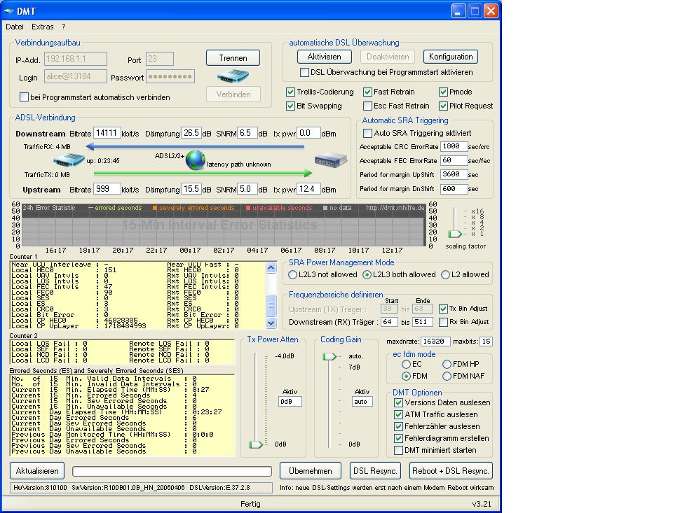 Hab das Siemens-Modem von Alice. Hier die Ergebnisse mit DMT. Beim zweiten Bild ist ein Scrollbalken nach unten gescrollt