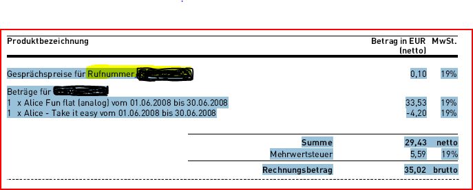 1 x Alice Fun flat (analog) vom 01.06.2008 bis 30.06.2008 33,53 19%