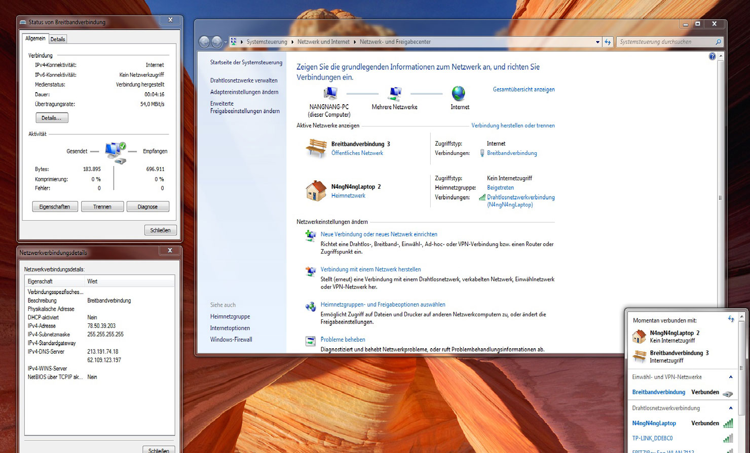 der zweite screenshot ist, wenn ich micht per breitbandverbindung ins internet einwähle. obwohl natürlich diese verbindung auch per wlan zustande kommt, da ich ja kein kabel benutze. verstehe nur nicht weshalb ich die breitbandverbindung anlegen muss, da ja ein eingerichtetes wlan existiert. damit müsste es ja gehen.