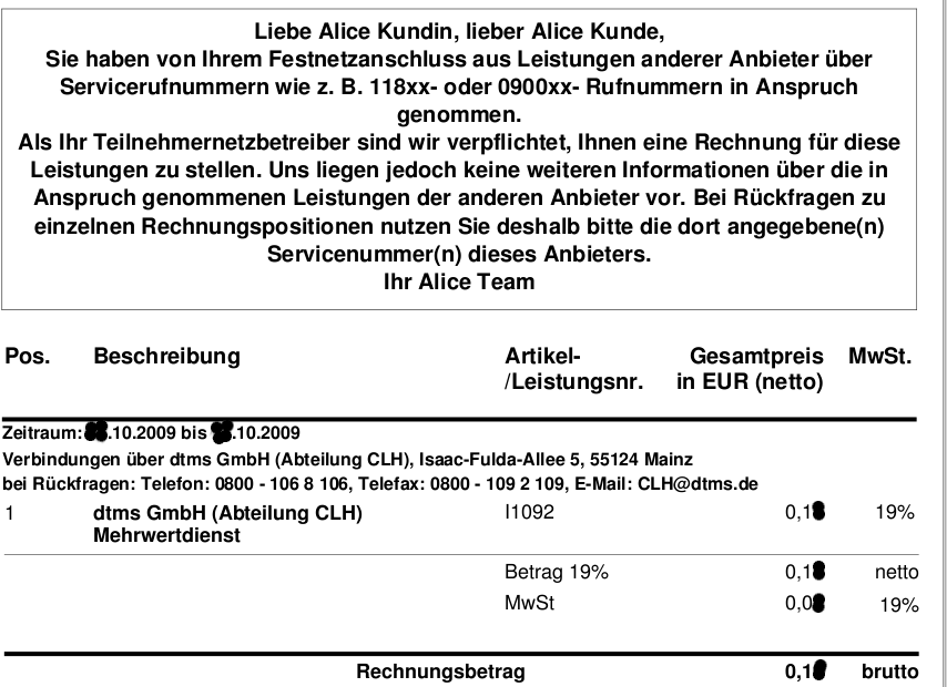 Neben den aktuellen technischen Problemen bin ich heute auf eine Zusatzrechnung in meinen Online-Rechnungen gestoßen. Laut diesem Wisch hätte ich 2009 die Dienste von dtms GmbH für einige Cent in Anspruch genommen. Als ich dann ohnehin mit der Hotline telefonierte wies ich darauf und auf die komplette Sperrung von Bezahl- & Auslandsnummern hin. Dies wurde mir auch vom Hotline-Mitarbeiter bestätigt. Man verband mich weiter zur Rechnungsstelle, wo ich die Sache nochmals schilderte. Doch dort erklärte man mir, dass gar keine Bezahlnummer(Telefonnr. des Dienstes der angerufen wurde) auf der Rechnung steht und ich mich doch erst an die Reklamationsstelle von dtms wenden müsste, da man nicht nachvollziehen könnte welche Rufnummer ich denn gewählt hätte und ob diese denn zu den gesperrten gehört.