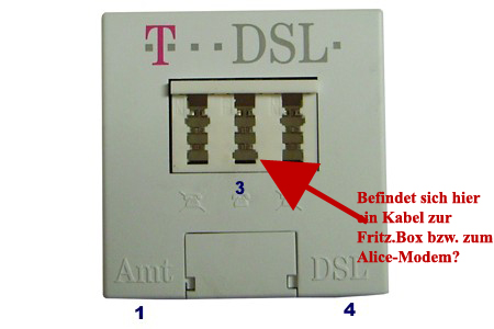 Befindet sich ein Kabel in der mittleren Telefon-Buchse am Splitter, das zum Alice-Modem bzw. zur Fritz.Box geht?