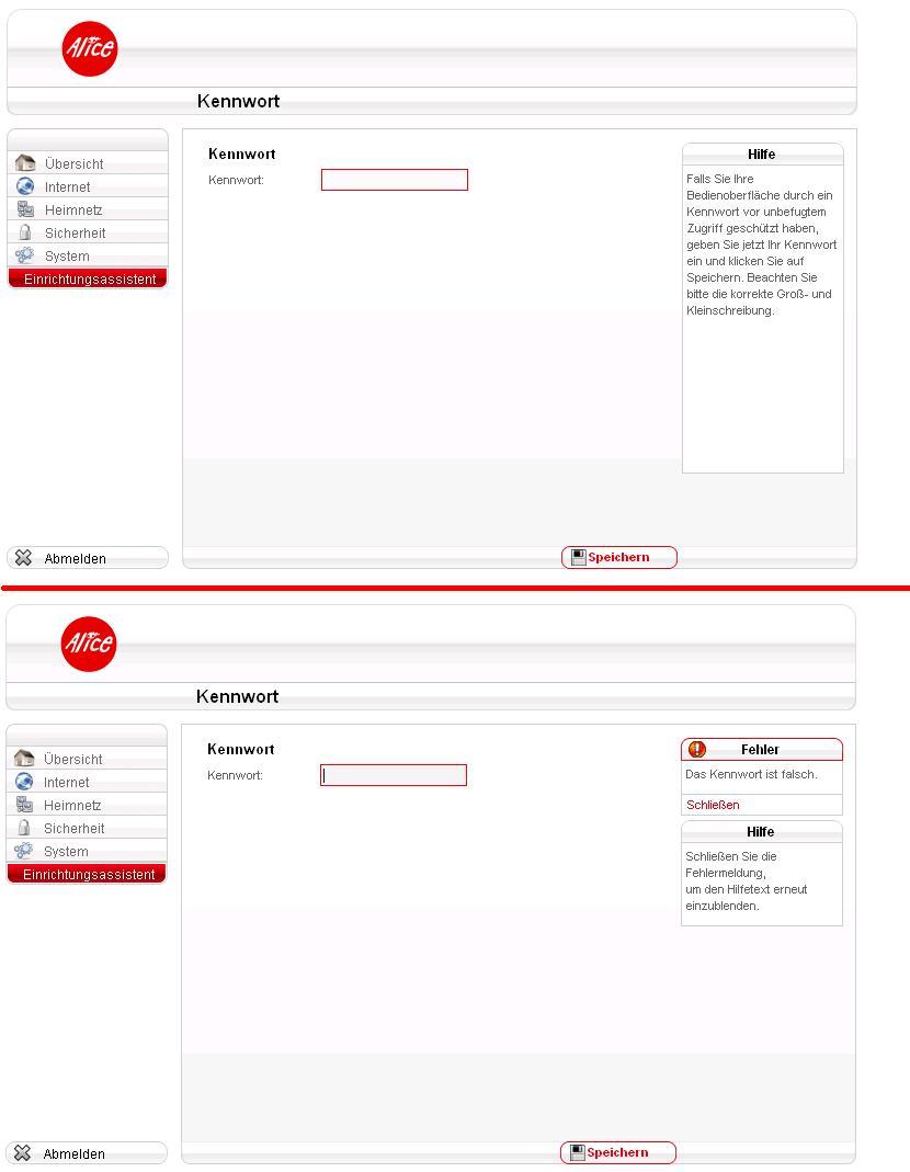 Nun wollte ich mal ein wenig in den Einstellungen des Modems stöbern, gebe im Firefox oder auch Internet Explorer "alice.box" ein und komme zu der Seite, aber sie verlangt ein Kennwort. Ich gebe das Kennwort aus dem Brief - also Zugangsdaten ein - es ist angeblich falsch! Ich sehe so schön auf der linken Seite die verschiedenen Punkte "Übersicht" - "Internet" und so weiter, kann aber nichts machen! Auch 1234 oder 0000 was ja beliebte kennwörter sind geht nicht. Vor allem steht da ja FALLS wir die Benutzeroberfläche mit einem Kennwort geschützt haben - was aber keiner tat da ich jetzt zum ersten mal da rein gehe - aber auch das Feld leer lassen und auf speichern gehen ergibt = Das KEnnwort ist falsch!