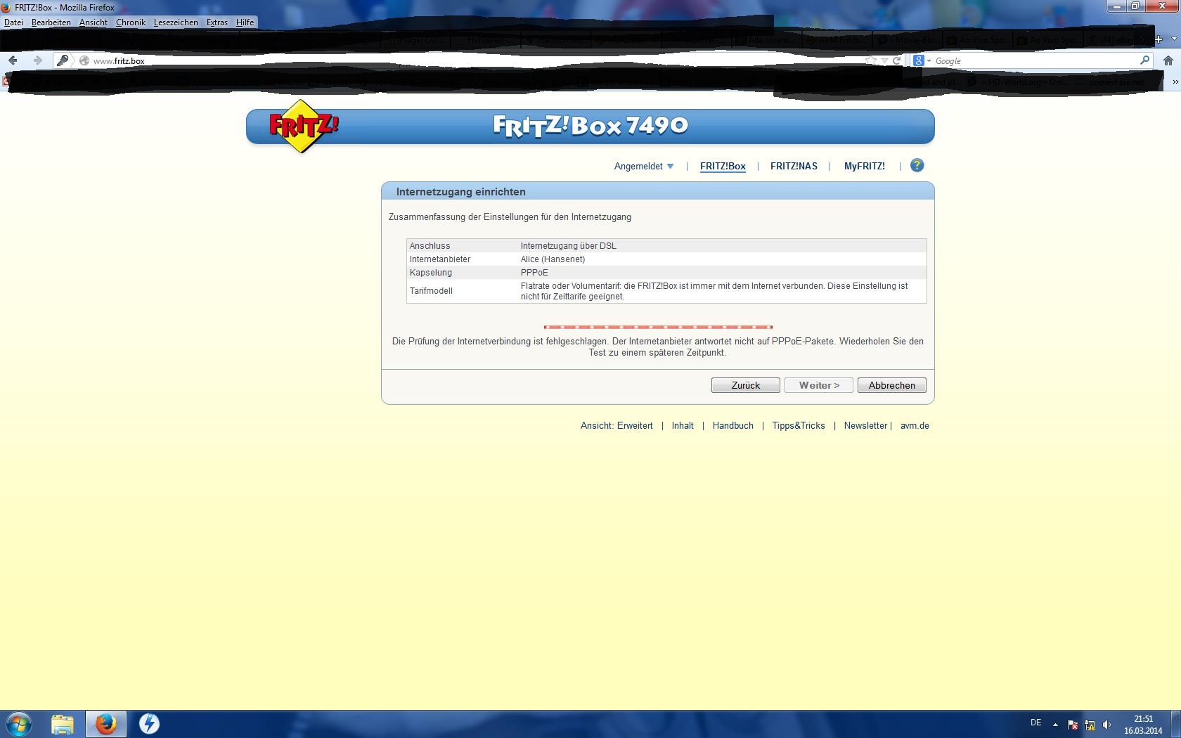 "Anmeldung beim Internetanbieter ist fehlgeschlagen. [...]"