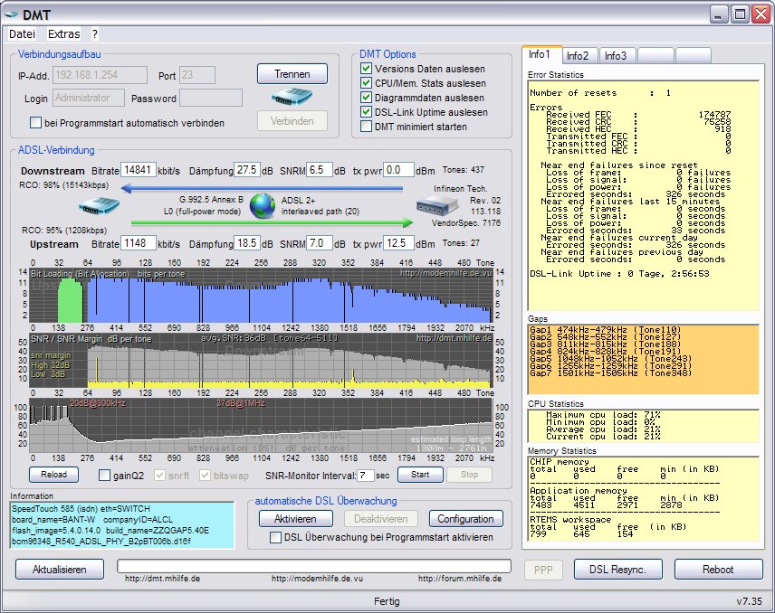 11.06.08 13:30:23 DSL ist verfügbar (DSL-Synchronisierung besteht mit 12124/1148 kbit/s).