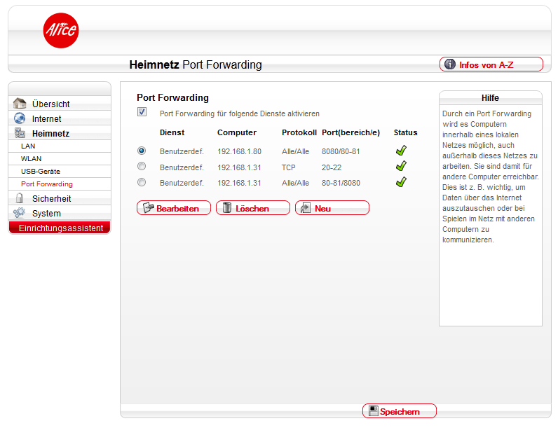 Wobei hier der Fehler eindeutig zu erkennen war, das Portorwarding des/der gleichen Ports an zwei Rechner/verschiedene IP's geht logischerweise nicht. Da ist ja nicht erkennbar für welche Adresse die eingehenden Daten bestimmt sind. Ein guter Router bzw. Firmware sollte solche Fehlkonfigurationen erkennen und eine entsprechende Meldung ausgeben, aber wir haben es hier ja leider mit einem Alice/O2 IAD zu tun. :(