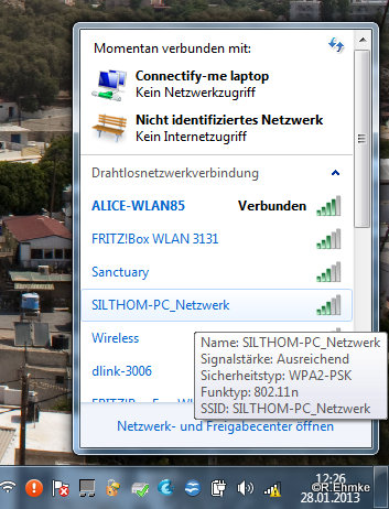 Bei meinem neuen Läppi mit windows 7 gehts nicht. Er zeigt zwar nach Eingabe des Schlüssels eine Verbindung zum WLAN Netz an baut aber keine I-Net Seite auf. Im Netzwerkfreigabezenter wird ja bildlich die Verbindung zwischen Computer und Netz dargestellt, da aber ein fettes rotes Kreuz zwischen. Irgendetwas stört.