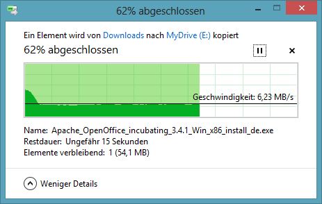 das Problem besteht schon seit Beginn an (April 2012). Der Datentransfer im Netzwerk ist über WLAN eine Katastrophe (siehe Screenshot). Dabei ist es egal, ob ich den USB-Slot am IAD 3232 nutze, meinen NAT-Server mit Daten beschreiben will oder auf andere Rechner zugreifen möchte: über WLAN ist die Datentransferrate nicht zumutbar! Stelle ich auf Netzwerkkabel um, "flutscht" es prima. Egal von wo nach wo, immer so zwischen 6 und 7 MB/s. Ja, es ist nicht wirklich flott, aber das reicht mir. Es liegt auch nicht an meinem Laptop, die anderen Laptops haben das gleiche Krankheitsbild. Als ich noch bei der Telekom war, hatte ich den Speedport W701 im Einsatz, dort lief es mit der jetzigen Hardware ohne Probleme.