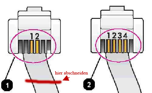 Dazu nimmst du ein gewöhnliches Telefonkabel (meistens Schwarz), schneidest den Clip-Stecker ab, nimmst die Kontakte 1 und 2 (wie unten im linken Bild) und verbindest diese mit dem Kabel, das vom Splitter zur Telefondose ging.