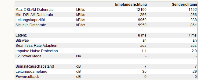 So sieht meine mittelmäßige Leitung grad aus, bei den "Einstellungen" ist der zweite Button von links, also fast max. Sicherheit, aktiviert. Ist übringens grad eine verdammt schnelle Synchronisation (ich wundere mich, dass die schon seit zwei Tagen hält), normal hab ich bei der Einstellung eine Aktuelle Datenrate von ca. 8200.