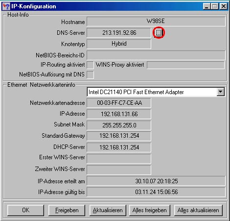 Schritt 4: In diesem Fenster kann man durch klicken auf den ...-Button noch die DNS-Server, die derzeit von dem Netzwerkadapter genutzt werden, abfragen.