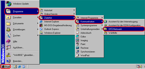 Schritt 1: Wir beginnen mit Start und klicken uns dann weiter durch Programme - Zubehör - Kommunikation - DFÜ-Netzwerk.
