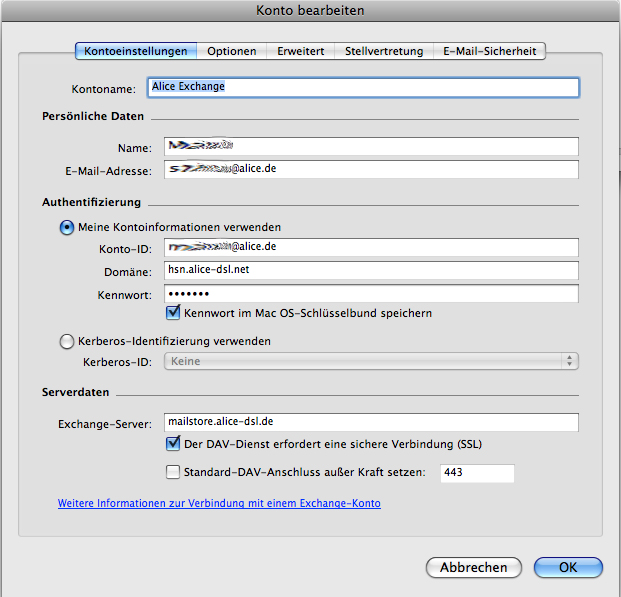 Ich habe gestern einfach mal meine Alice Sub E-Mail in Entourage als Exchange Konto eingerichtet.